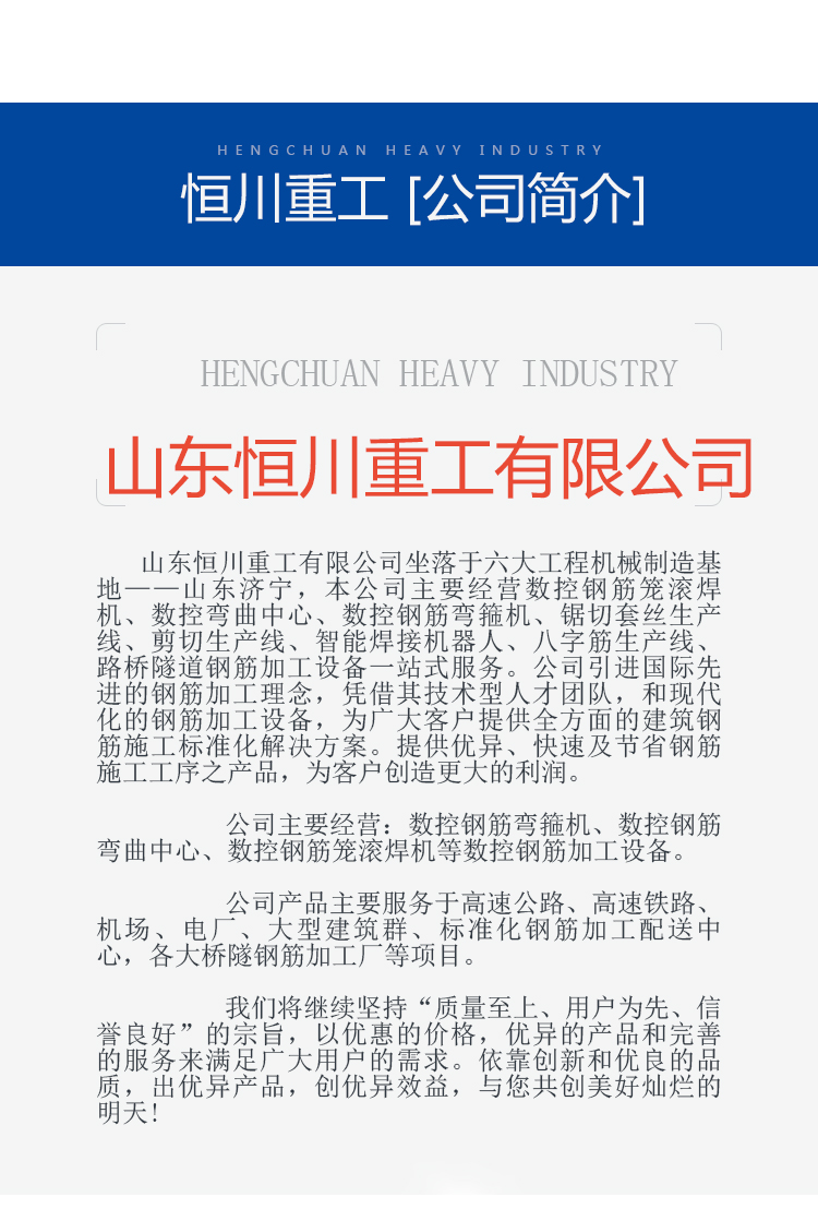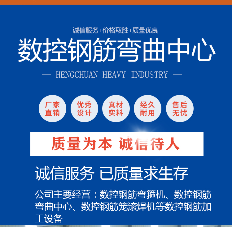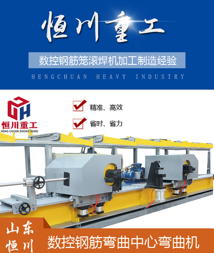 数控钢筋弯曲机是山东恒川重工有限公司专为高层建筑、高速公路、高 速铁路、大型桥梁等工程混凝土结构内主骨架钢筋的弯曲加工高性能产品,能加工直径φ36mm 的高强度螺纹钢。本机特点是中间有一个钢筋加紧机构,有两个机头在特定的轨道上可以自由移动弯曲。具备在一个工作单元内同时进行弯曲的加工能力。是我公司独立研发的具有自主知识产权的钢筋加工设备。我们在研发上力求人性化,能满足各个层次的人群操作使用,同时加工精度高、效率高满足工程工期要求, 每个工作班相比普通弯