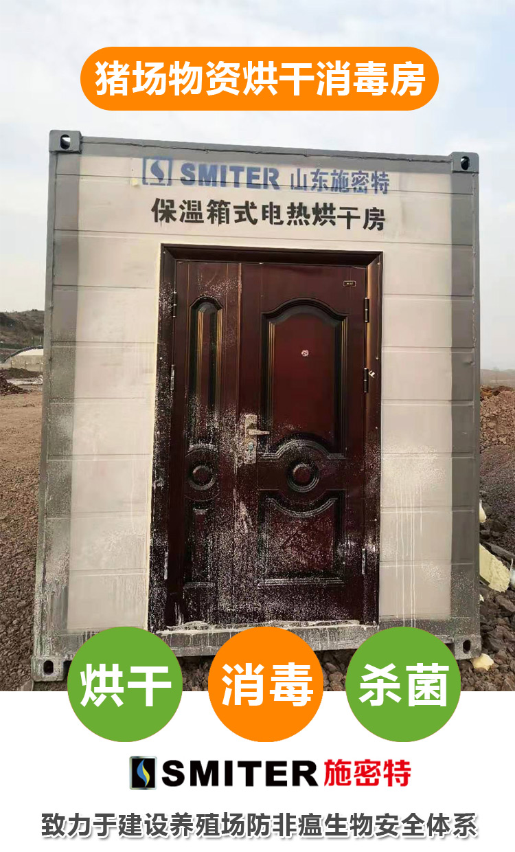 随着非洲猪瘟病毒的肆虐,俗语称“得猪者,得天下”,猪场生物安全体系的建设,是保障猪场安全的铠甲卫士,进场物资由于外接触面比较广,具有带病毒可能性。如果不对进场物资病毒进行彻底消杀,将会给猪场带来极大的安全隐患,山东施密特自行研发生产的“猪场物资烘干消毒房”将解决此类问题,保卫猪场安全。