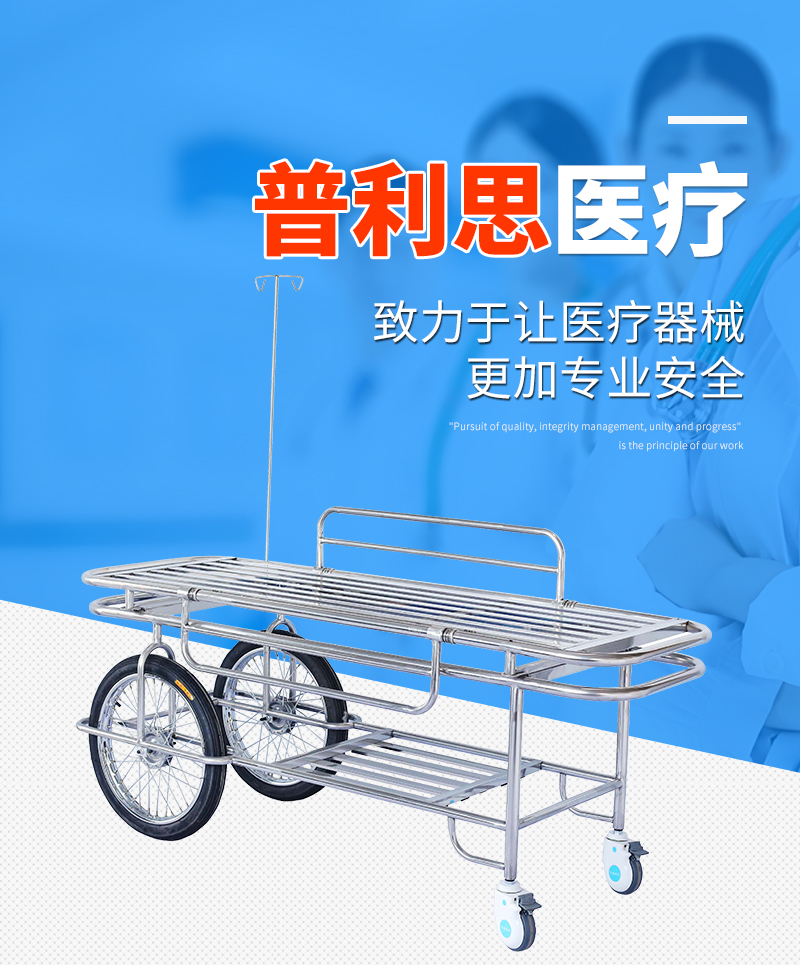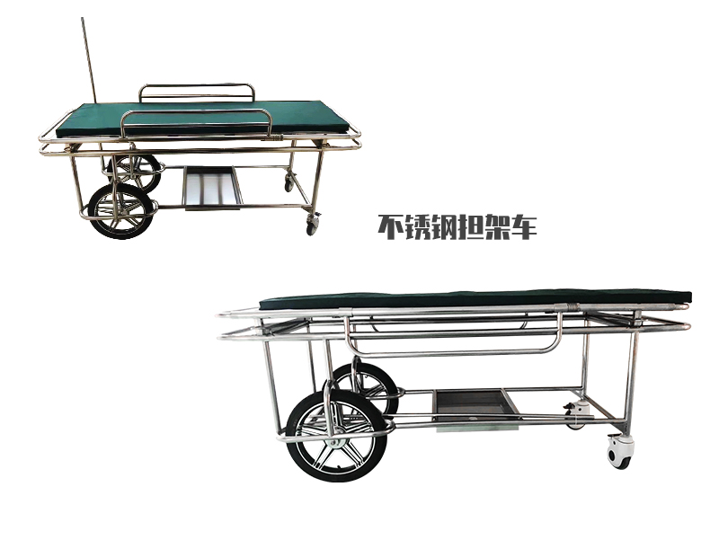 3、担架面:框架由直径32mm的圆管(厚度为1.2mm)和手握区(直径25mm圆管)组成,台面由优质不锈钢拉丝面板冲折、焊接而成。对角输液架孔,标配一个不锈钢输液架。设有护栏,使用时抬起,不使用时可落下,保证病人安全,护栏升落快速方便,护栏升起后自动锁止,操作简便,安全可靠。