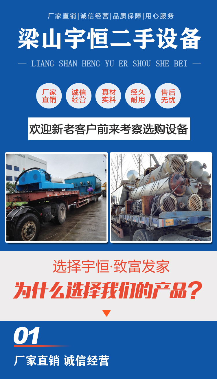 梁山宇恒二手设备有限公司所售产品现货供应,货源充足,规格齐全,业务遍及全国各地。多年来,本公司始终坚持“信誉为本,客户至上,以诚相待,薄利多销”的经营宗旨,产品销往国内二十七省市。公司对所售设备重质量讲信誉,价格合理、免费运输、跟踪服务、货到付款,并可对无技术的客户提供工程技术人员,从项目的设计、安装、调试、确保所售设备正常使用。免去用户对旧设备的一切后顾之忧。我们将以好的产品,优的服务,可靠的信誉,优惠的价格为您事业成功助一臂之力,经理携全体员工竭诚欢迎新老客户前来考察选购设备。
