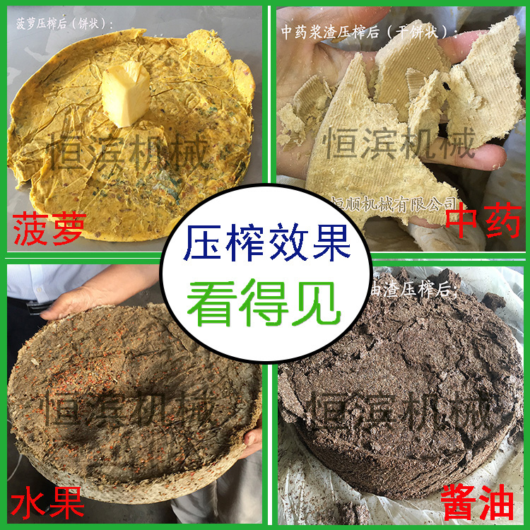 适用于各种中药材药渣、豆制品、腌渍菜、果蔬、酵素、酒糟等加工行业中进行压榨脱水、提汁、脱盐的主要设备,本机还可用于其它耐挤压物品的固液分离,不挑不拣,含水就能榨。