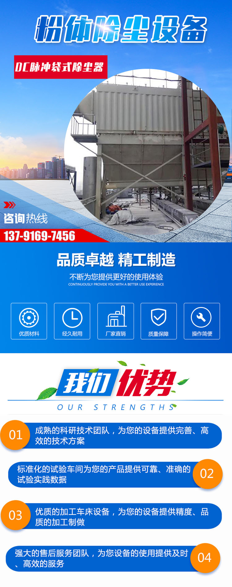 DC脉冲袋式除尘器主要由灰斗、中箱体、上箱体、喷吹装置及脉冲控制仪等几部分组成。