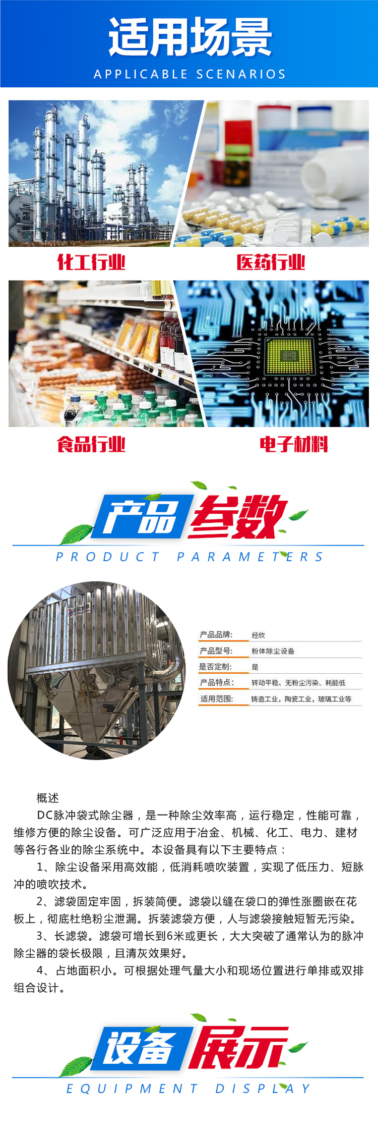DC脉冲袋式除尘器,是一种除尘效率高,运行稳定,性能可靠,维修方便的除尘设备。可广泛应用于冶金、机械、化工、电力、建材等各行各业的除尘系统中。本设备具有以下主要特点: