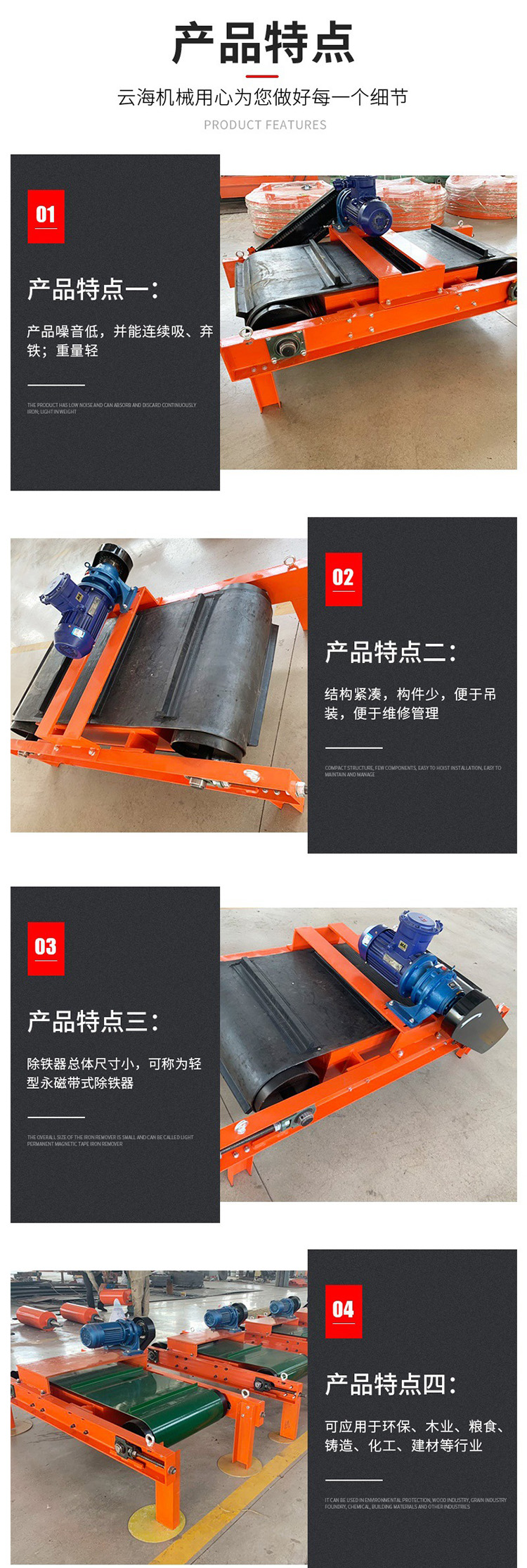 总体尺寸小,可称为轻型永磁带式除铁器,长度、高度分别是C型的:70%、86%。 噪音低,并能连续吸、弃铁。 重量轻,平均不到C型重量的75% 结构紧凑,构件少,便于吊装,便于维修管理、经济实用。
