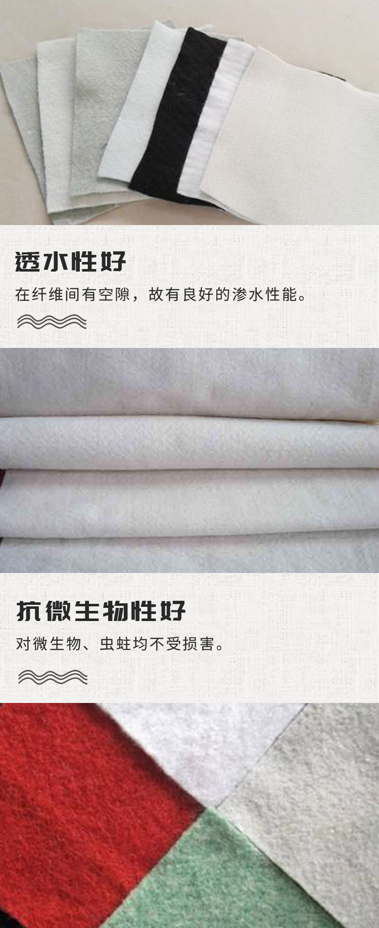 3、透水性好在纤维间有空隙,故有良好的渗水性能。