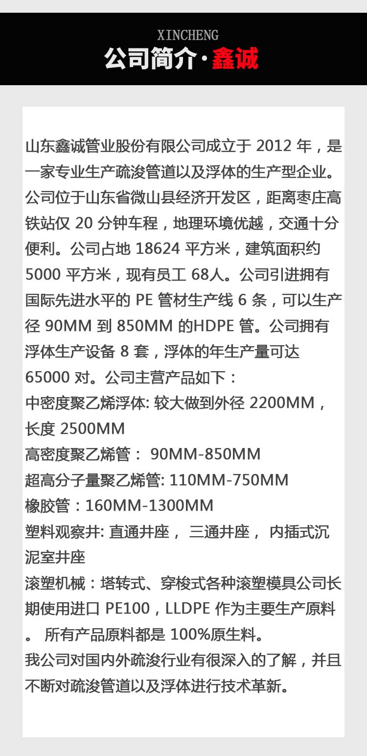 山东鑫诚管业股份有限公司成立于 2012 年,是一家专业生产疏浚管道以及浮体的生产型企业。公司位于山东省微山县经济开发区,距离枣庄高铁站仅 20 分钟车程,地理环境优越,交通十分便利。公司占地 18624 平方米,建筑面积约 5000 平方米,现有员工 68人。公司引进拥有国际先进水平的 PE 管材生产线 6 条,可以生产径 90mm 到 850mm 的HDPE 管。公司拥有浮体生产设备 8 套,浮体的年生产量可达 65000 对