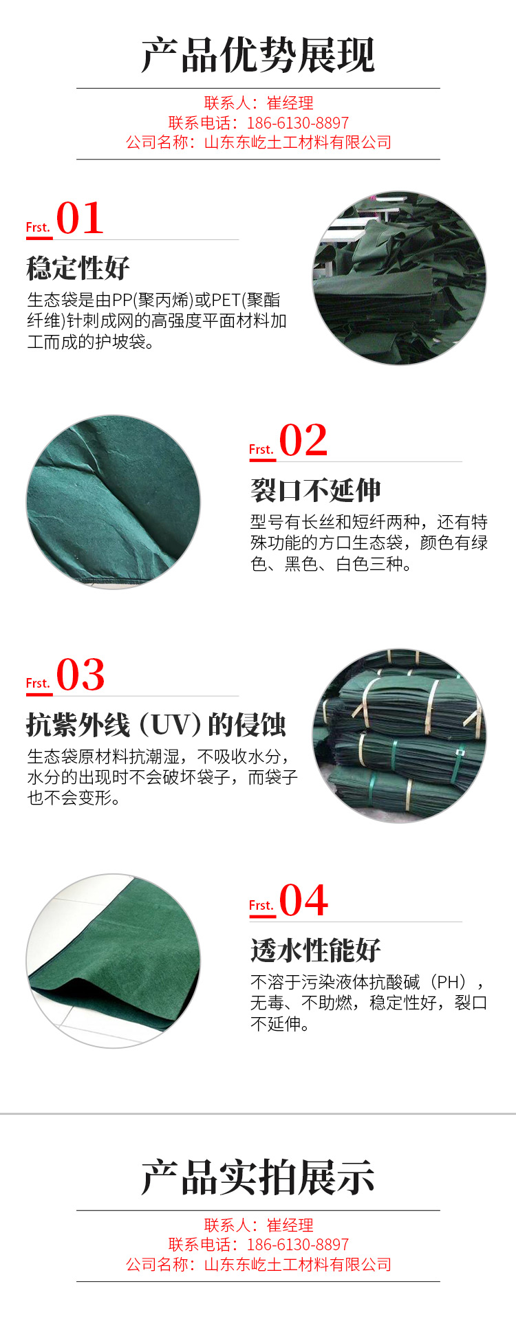 生态袋是由PP(聚丙烯)或PET(聚酯纤维)针刺成网的高强度平面材料加工而成的护坡袋,常规规格815×430毫米,型号有长丝和短纤两种,还有特殊功能的方口生态袋,颜色有绿色、黑色、白色三种。