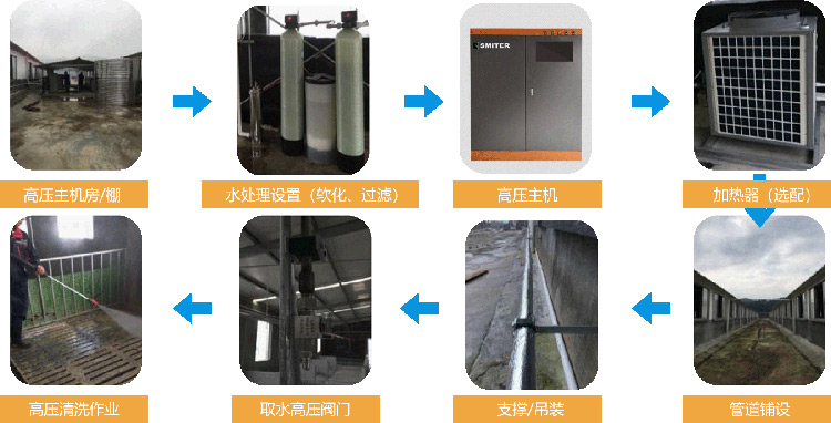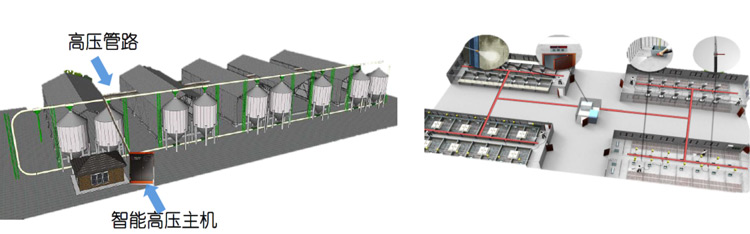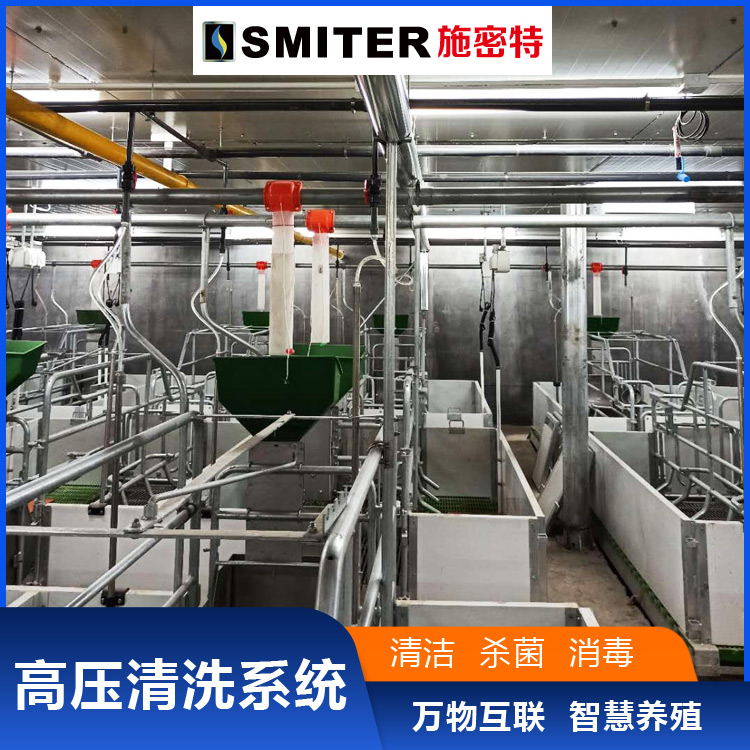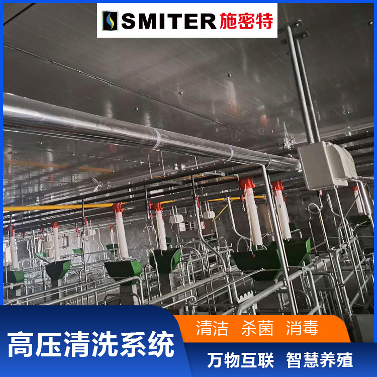 施密特集中式高压清洗系统广泛应用于禽畜等棚舍清洗、高温杀菌消毒。在猪场合适的地点,放置高压主机,通过分布式高压管道,将每栋猪舍的高压取水阀门相连,从而保证任意位置均可获得高压水资源。