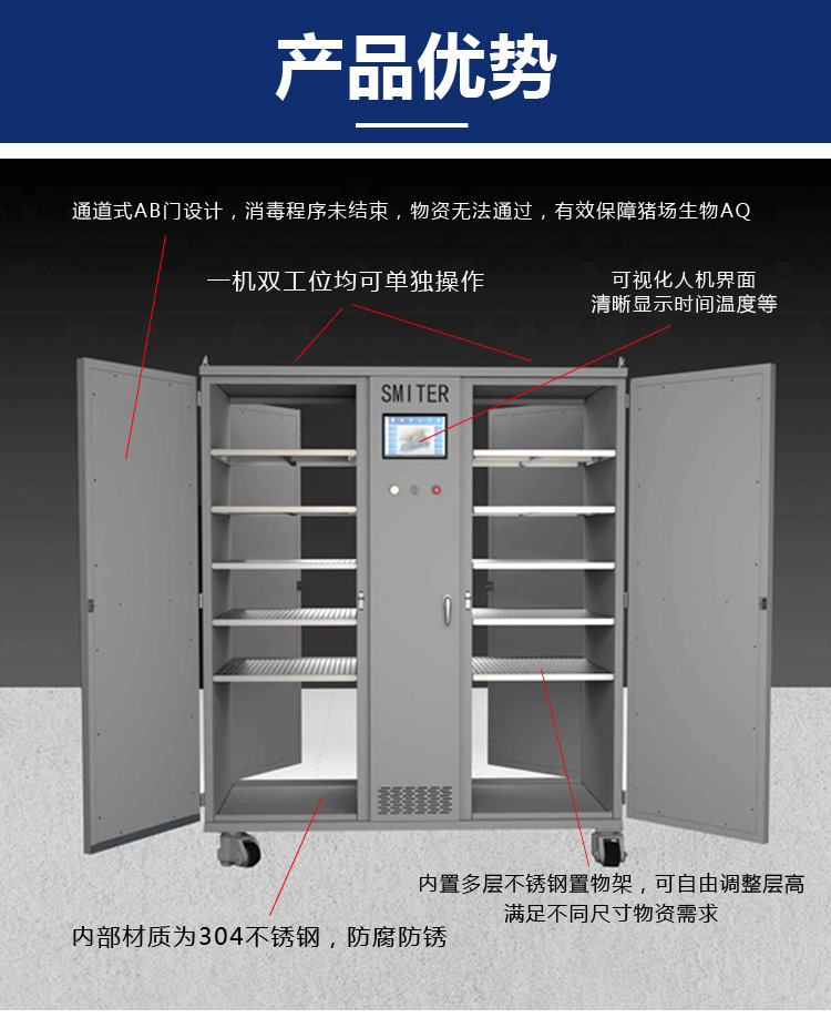 随着非洲猪瘟病毒的肆虐,进猪场物资的安全性作为防非瘟保安全的一个重要环节,施密特物资高温烘干消毒柜可以实现高温、臭氧、紫外线功能,养殖单位可根据物资种类选择不同功能,可在10分钟以内快速升温至80℃,能有效的杀灭非瘟病毒。设备采用PLC触摸屏控制,使用操作简单。