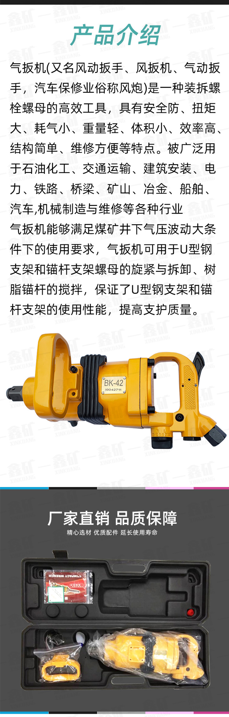 BK气扳机是拆装螺钉螺帽的高效率机械工具,BK气扳机在石油、化工、铁路、桥梁、汽车、电力、矿山、船舶、建筑等行业均有着广泛的用途。BK气扳机具有体积小,重量轻,耗气量小,扭矩大,噪音小等优点,BK气扳机不仅能大大提高劳动生产率,BK气扳机还能显著减轻操作人员的劳动强度。15963783037