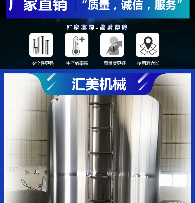 不锈钢储罐,是以不锈钢为原料制成的储罐。和普通的滚塑储罐相比,不锈钢储罐可以耐受更高的压力,在很多高压场合广泛使用,同时不锈钢储罐有个很显著的特点:罐体密封性能优异,彻底杜绝了空气中有害物质和蚊虫的侵入,确保罐内存放的液体不会受到外界污染,不会滋生红虫,因此不锈钢储罐大多用来储运食品,药品,并广泛的用于酿酒业和乳业。