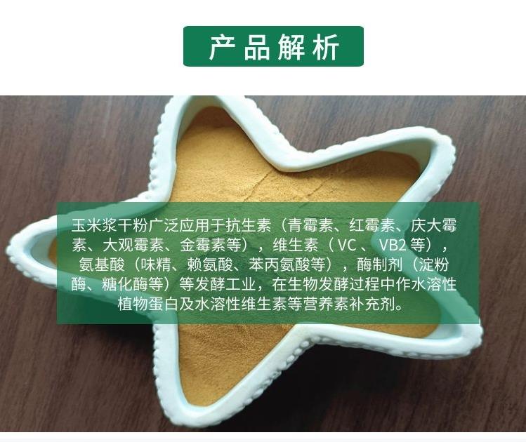 玉米浆干粉是由玉米淀粉副产物浸泡后的玉米浆初次加工为玉米浆膏,经烘干工艺后得成。保持了玉米浆原液的特性及营养成分做成干粉后更利于储存、运输、产品不宜变质、使用方便,从而降低生产成本。可以更好的替代蛋白质其它原料能够广泛用于复合肥料,植物培育等生化发酵领域,也可用于家禽饲料添加或直接用于水产养殖动物。