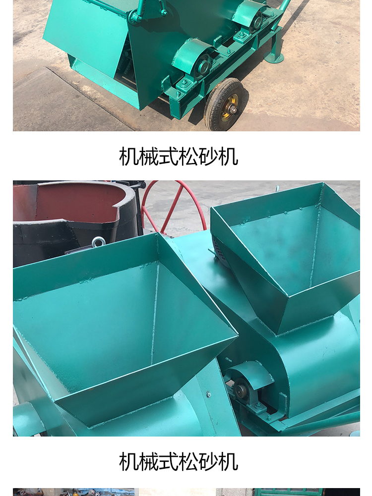 产品名称: 移动松砂机 工作原理: 移动松砂机是简单而适用的砂处理机器,集筛砂与松砂一体.利用高速旋转下的梳壮钢片抛射铸砂,将铸砂打碎,同时分解烧结砂块,去除杂物,使铸件外形光滑美观. 移动松砂机是简单而适用的砂处理机器,集筛砂与松砂一体。利用高速旋转下的梳壮钢片抛射铸砂,将铸砂打碎,同时分解烧结砂块,去除杂物,使铸件外形光滑美观。