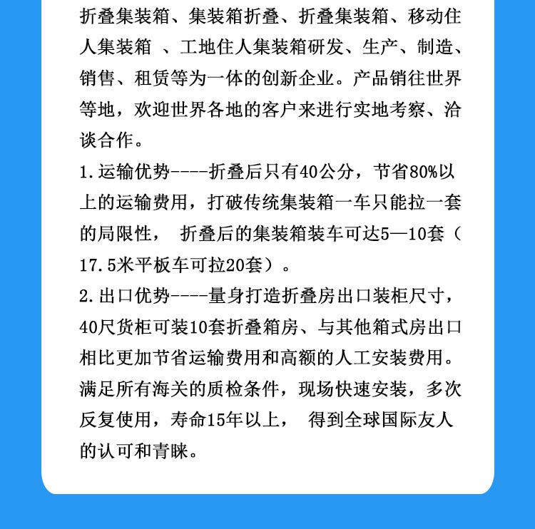 山东济宁佳信集成房屋有限公司占地面积13000平方,是专业从事折叠住人集装箱、折叠集装箱房屋、移动折叠式集装箱、易折叠集装箱房、可折叠集装箱、集装箱折叠、折叠集装箱、移动住人集装箱 、工地住人集装箱研发、生产、制造、销售、租赁等为一体的创新企业。产品销往世界等地,欢迎世界各地的客户来进行实地考察、洽谈合作。