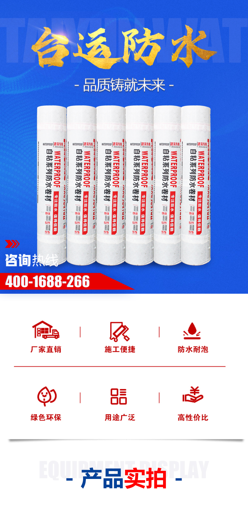 6、除主体材料外,表面材料聚乙烯膜也具有优良的防水性和很高的强度(聚乙烯丙纶卷材即仅以此膜防水),因此防水具有双重保险性。