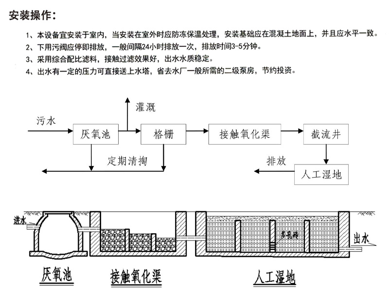 4、该成套设备自动化高,系统中风机、水泵等设备自控运行,减少操作工作量,本设备采用有效措施减少噪音和异味,对周围环境无影响。