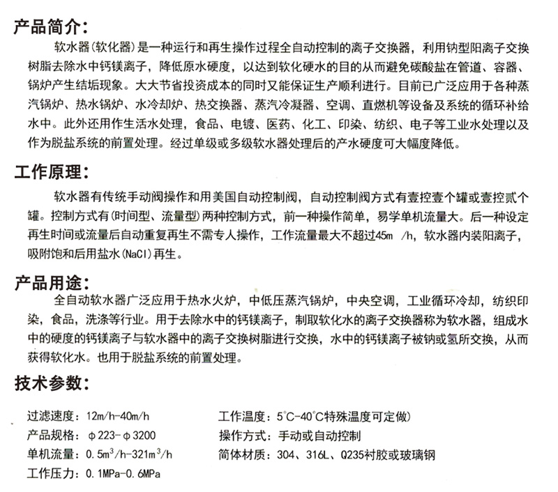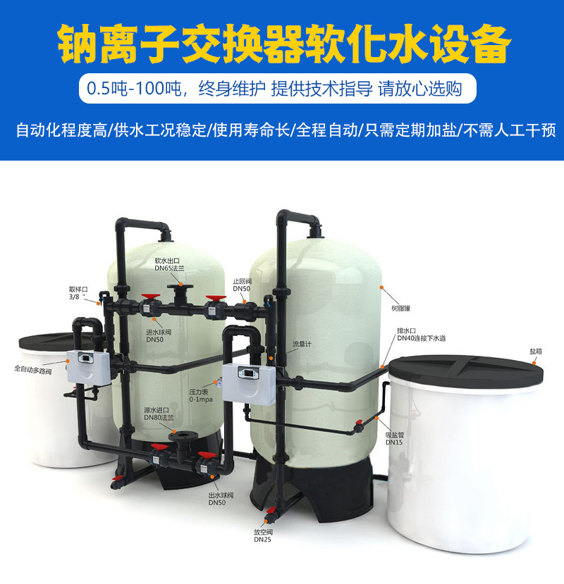 软化水设备即降低水硬度的设备,主要除祛水中的钙、镁离子,在进水为深井水或者水源硬度很大的情况下,其作用是去除水中的钙、镁离子含量,使水中钙镁离子减少,包括三部分,即离子交换部分、盐再生部分和控制部分。软化水设备可广泛应用于工业锅炉、冷却循环水、炼钢、轧钢等系统的补给水软化,还可用于酒店、公寓、洗浴等生活用水的软化处理及印染、化工、纺织、医院等行业的软化水处理