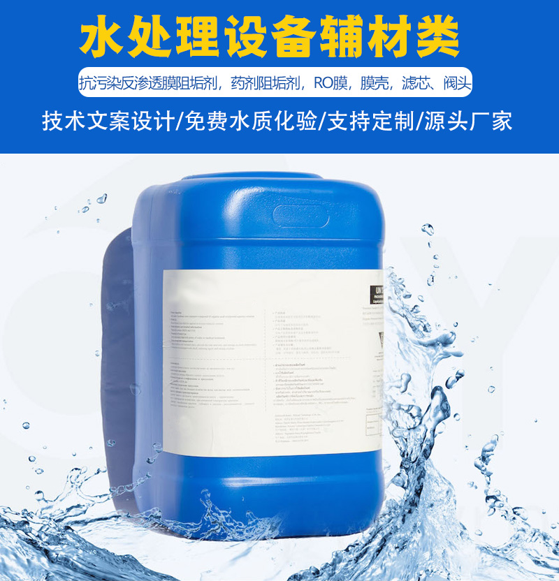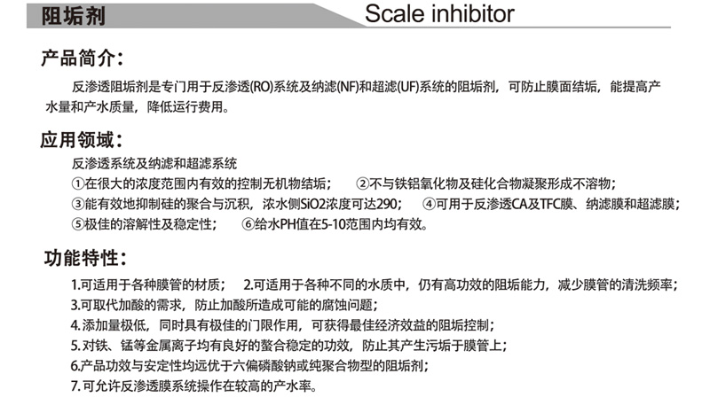 反渗透阻垢剂,阻垢效果好,使用范围广,对常规水质均能起到良好的阻垢、分散效果。特别适用于金属氧化物和硅,以及碳酸盐、硫酸盐和氧化铁沉淀造成的结垢。其阻垢效能高,且不与残留凝聚剂或富铝富铁的硅化合物发生凝聚形成不溶聚合物。在无离子交换预处理的反渗透(RO)、纳滤(NF)或超滤(UF) 系统中用来防止结垢,提高产水量和产水质量。