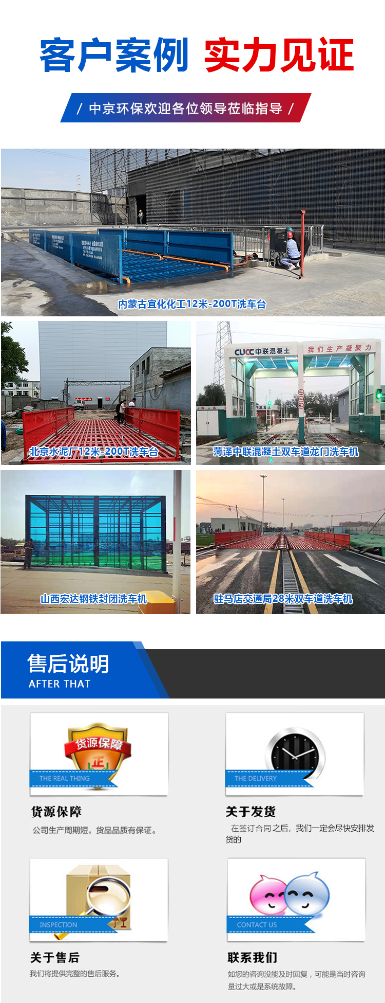 我司生产的工程洗车机,能有效地解决了施工场地的扬尘和对路面的污染,该设备利用多方位高压水枪对轮胎及底盘部位进行高压冲洗,从而达到将车轮及底盘洗净的效果,打到各部门上路的要求,把施工场地的泥沙挡在了门口以内。工程车辆洗车机是按市场需求所衍生的第三代新型自动控制自动洗车机,公司拥有长期从事自动洗车机生产研发的技术人才,引进国内外成熟技术,开发出的系列产品均已达到较高水平。工程车辆洗车机产品形式多样化,品种齐全,坚持科技创新,大大降低了洗车机的故障率和维修率,设备具有自动程度高、冲洗速度快、安装简便、循环用水、泥沙快速自动沉淀、自动排除泥沙等功能,可满足不同场地、不同状态下的快速安装使用,是标准化工地必备设备。让工程运输车辆干干净净的上路,让我们的城市更干净,让我们的市民摆脱“吸尘器”的角色,能自由的做个深呼吸,这是我们公司不断努力和追求的目标。
