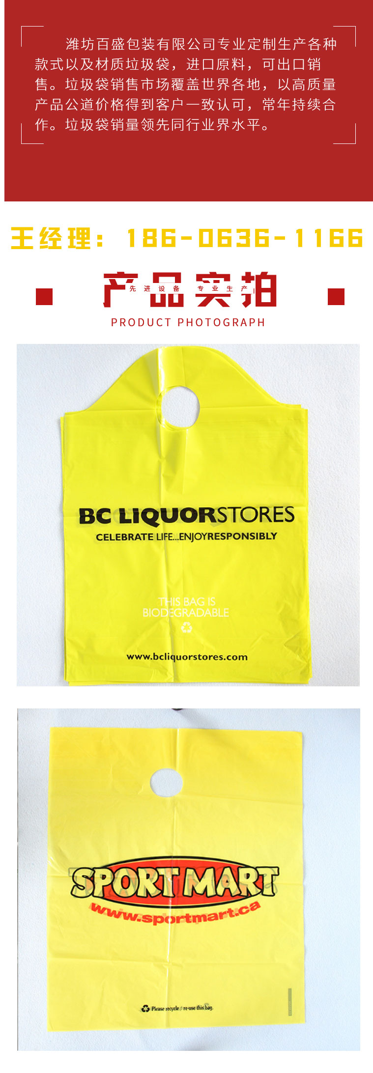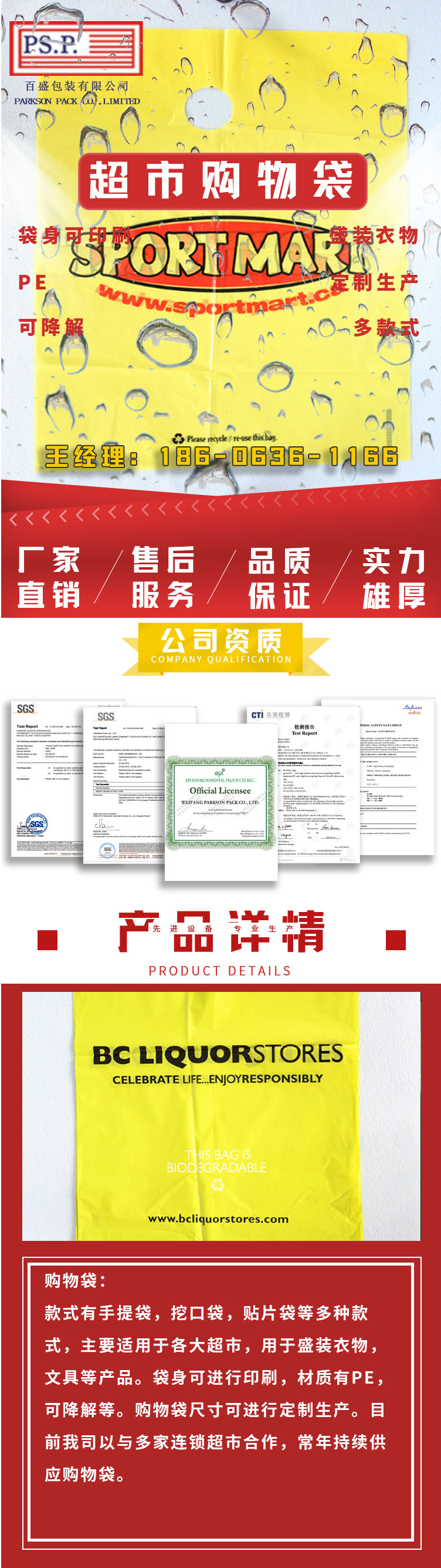款式有手提袋,挖口袋,贴片袋等多种款式,主要适用于各大超市,用于盛装衣物,文具等产品。袋身可进行印刷,材质有pe,可降解等。购物袋尺寸可进行定制生产。目前我司以与多家连锁超市合作,常年持续供应购物袋。