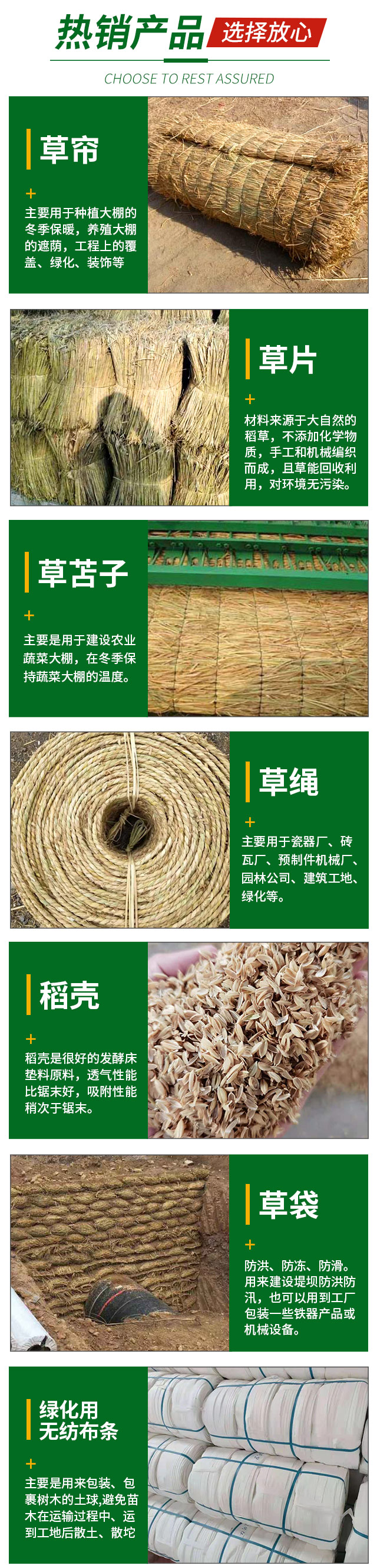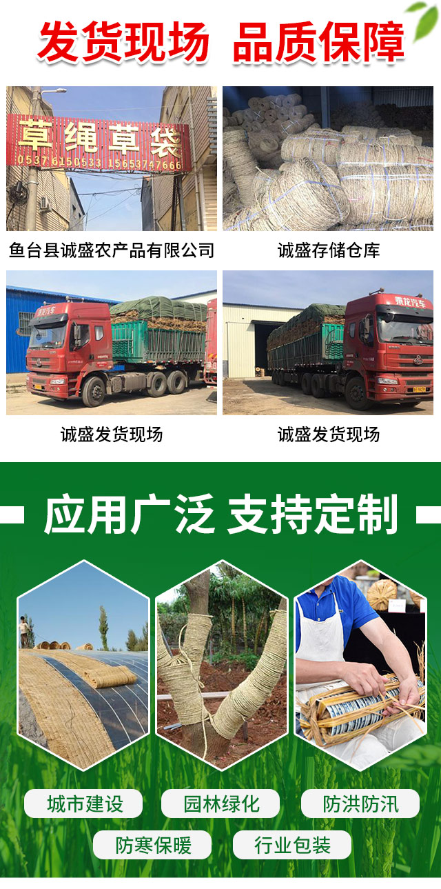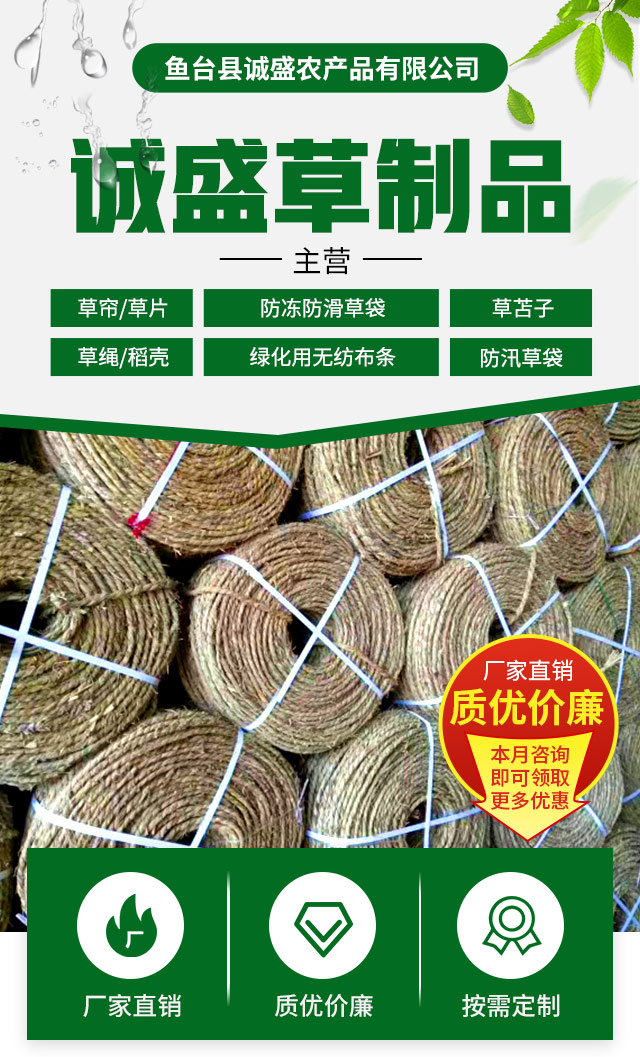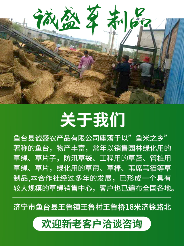 鱼台县诚盛农产品有限公司座落于以”鱼米之乡”著称的鱼台,近靠景色秀丽的微山湖畔,物产丰富,常年以销售园林绿化用的草绳、草片子,防汛草袋、工程用的草苫、管桩用草绳、草片,绿化用的草帘、草棒、苇席苇箔等草制品,本合作社经过多年的发展,已形成一个具有较大规模的草绳销售中心,客户也已遍布全国各地。