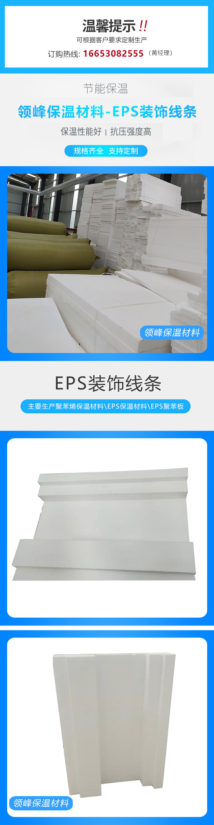 EPS装饰线条不受温度变化影响,耐寒,耐热;不受潮湿气侯及酸雨的影响。EPS装饰线条能防火又不会发出有毒物质,是环保的优质装饰建材产品。EPS装饰线条采用电脑数控切割,制作快捷,品种型号多,如线条、罗马柱、窗套、斗拱等,可以安装在窗的四边,门边,檐角和墙身;使建筑物的外立面更加美观,更为建筑设计师们带来崭新的、别样的创意。