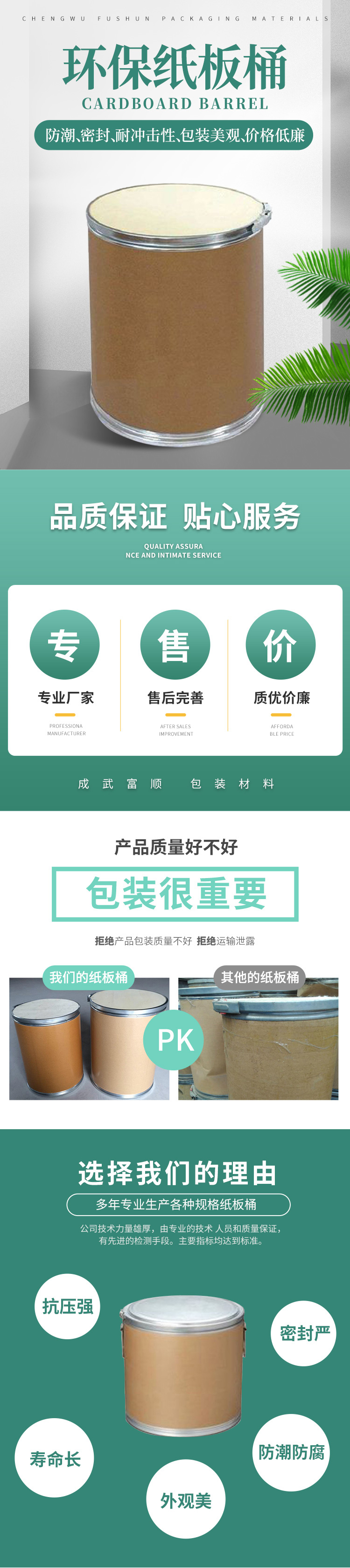 纸板桶由胶合板做底盖,带钢做箍,以不同规格材质的牛皮卡纸、底箱板底,通过专用设备卷造而成,专用的粘胶剂用聚乙烯醇做原料,无毒无味,确保桶身强度。纸板桶做为包装容器,广泛应用于固状、粉状、浆状产品,适用于化工、制药、染料、粘合剂、贵重金属材料包装。