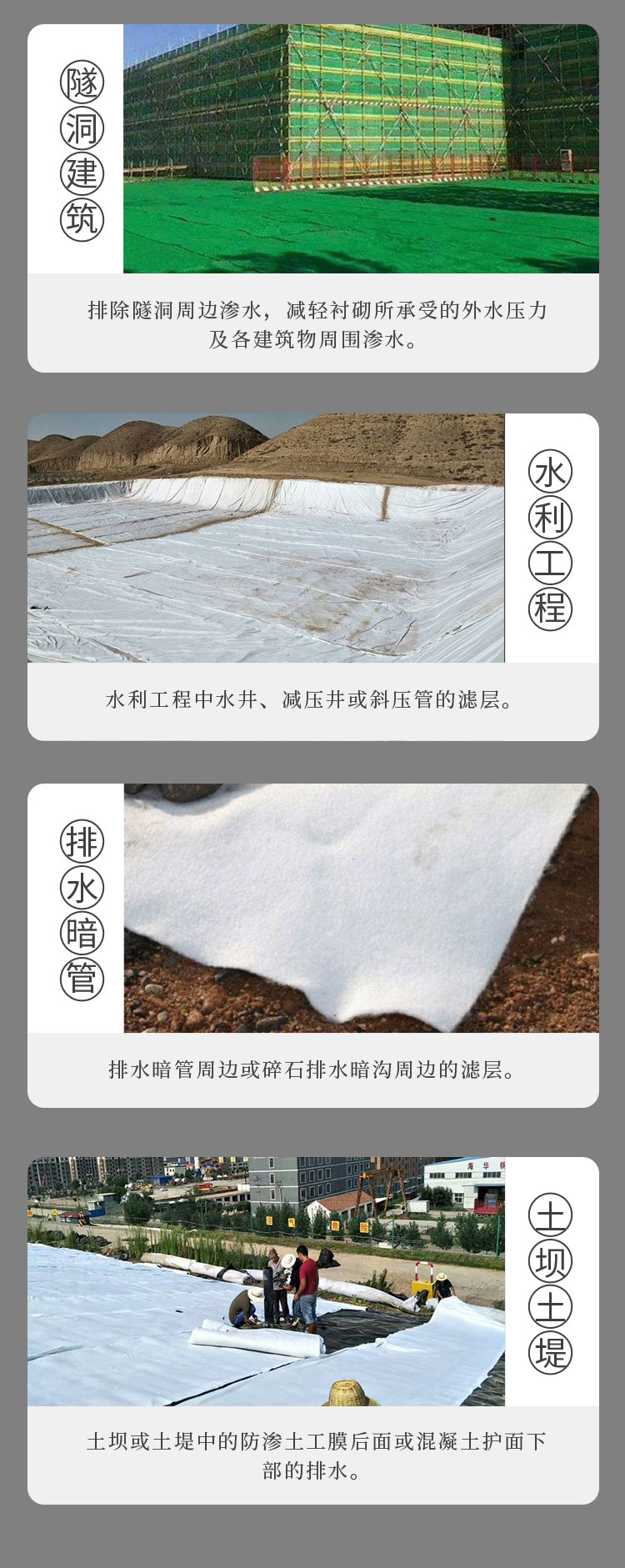渗透性及平面排水性——土工布较厚且是针刺成型的,具有良好的平面排水和垂直透水性,多年后仍能保持此性能;