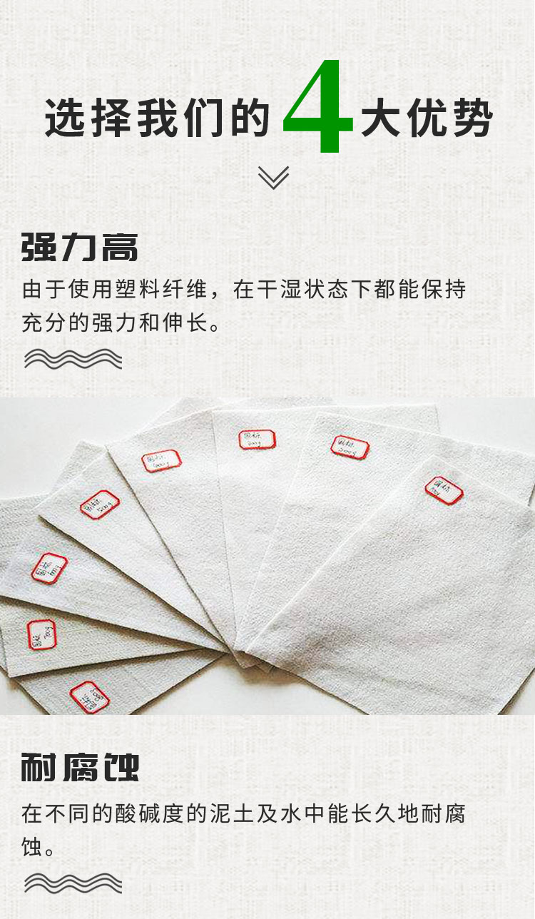 耐蠕变性——土工布耐蠕变性优于其它土工布,因此长效性好。它能耐土中常见化学物质的侵蚀以及耐汽油、柴油等的腐蚀;