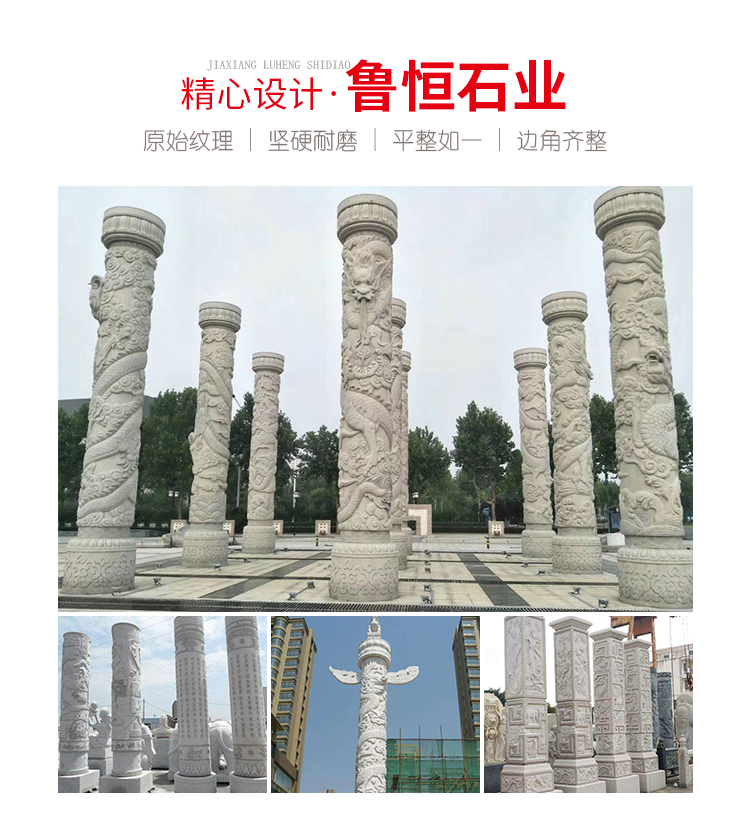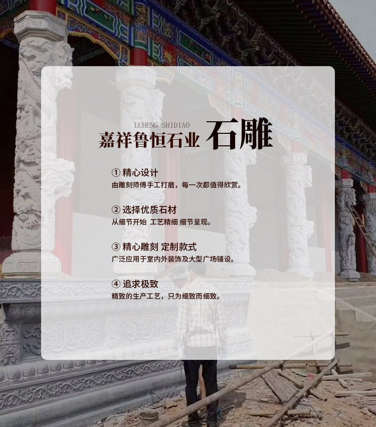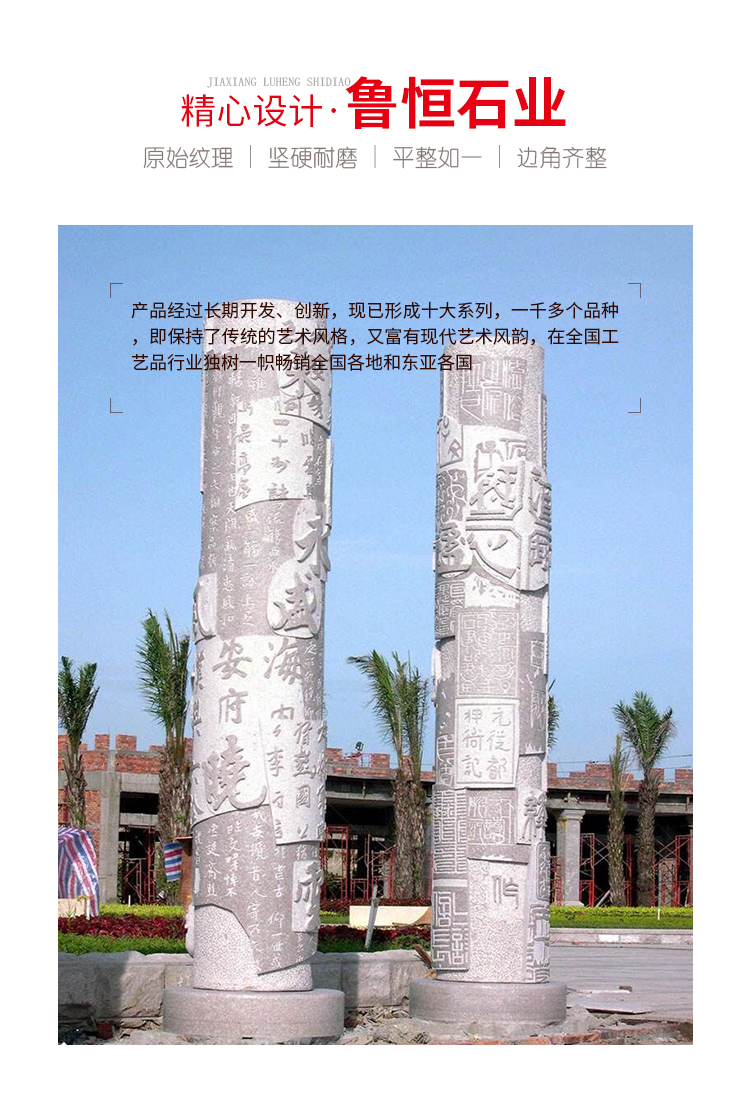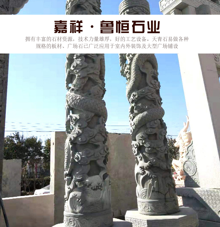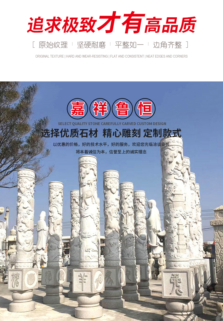 嘉祥鲁恒石业有限公司具有圆雕、透雕、线雕、浮雕等多种工艺,可为城市机关、企业、公园、旅游景点、古城古建等部门提供各种适应的石雕艺术品。均采用优良天青石、汉白玉、砂岩、大理石、花岗石、雪花白等石材雕刻成各种世术用品和摆件。例如、历史人物、神像、花鸟、走兽、香炉、石亭、石塔、石桥、石牌坊、龙柱、灯笼、浮雕、栏杆、石狮、园艺、石桌、石椅、石凳等,可谓琳琅满目,品种繁多。产品经过长期开发、创新,现已形成十大系列,一千多个品种,即保持了传统的艺术风格,又富有现代艺术风韵,在全国工艺品行业独树一帜畅销全国各地和东亚各国。