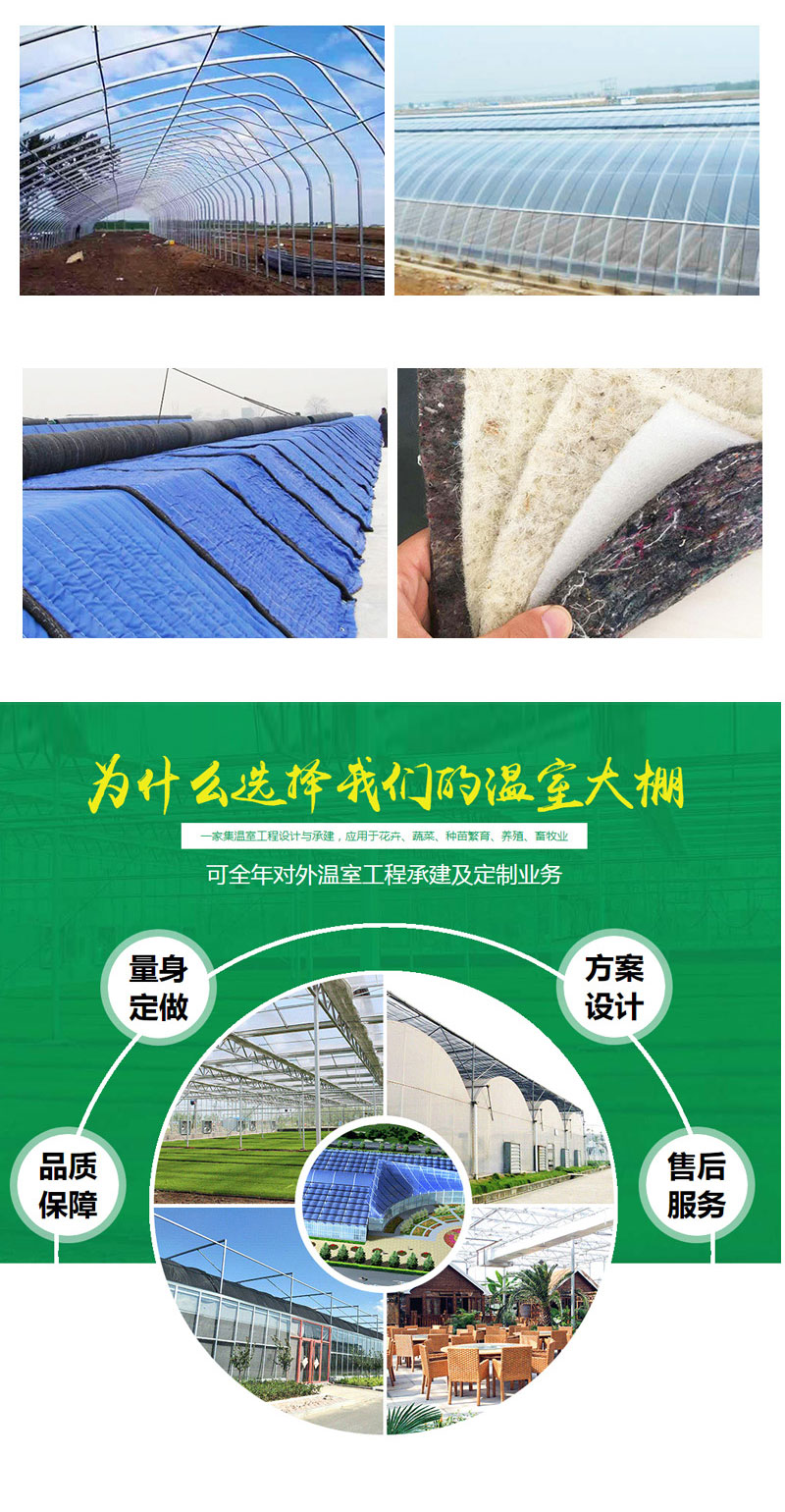 特点:美观坚固,框架结构简单实用,制造成本相对较低,属于经济型温室,夏季通风效果好,适合大规模蔬菜花卉种植,特别适用于南方地区使用。