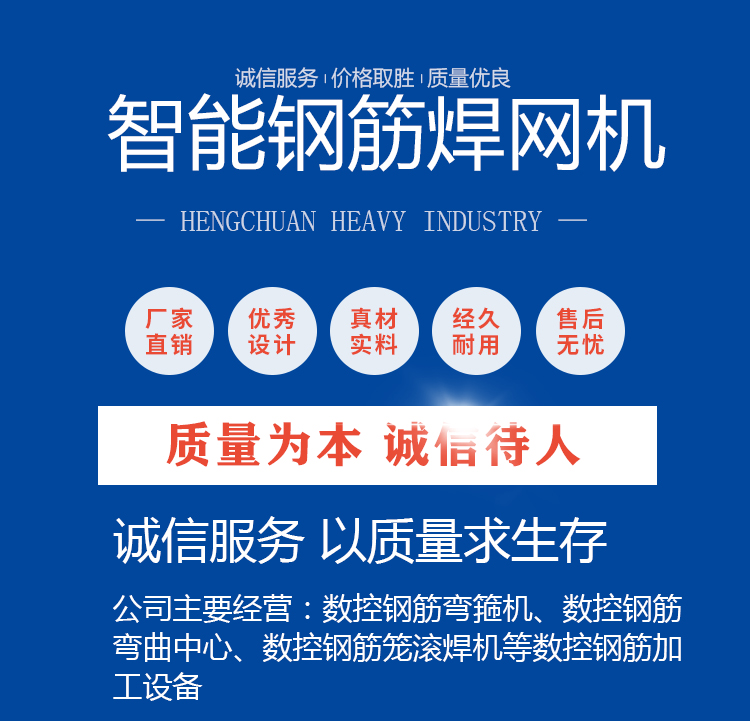 智能钢筋焊网机设备特别应用于工业与民用建筑的楼板,墙体,桥梁,混凝土路面,地台,机场,水泥管,混凝土预制件,挡土墙,山体公路坡面,隧道,码头,堤坝等领域。智能钢筋焊网机钢筋网是在用专门的焊网机将相同或不同直径的纵向和横向钢筋,用电阻点焊(低电压、高电流、焊接接触时间很短)焊接成形的网状钢筋制品。纵向钢筋和横向钢筋分别以一定间距排列且互成直角,全部交叉点均由电阻点焊在一起的钢筋网片。