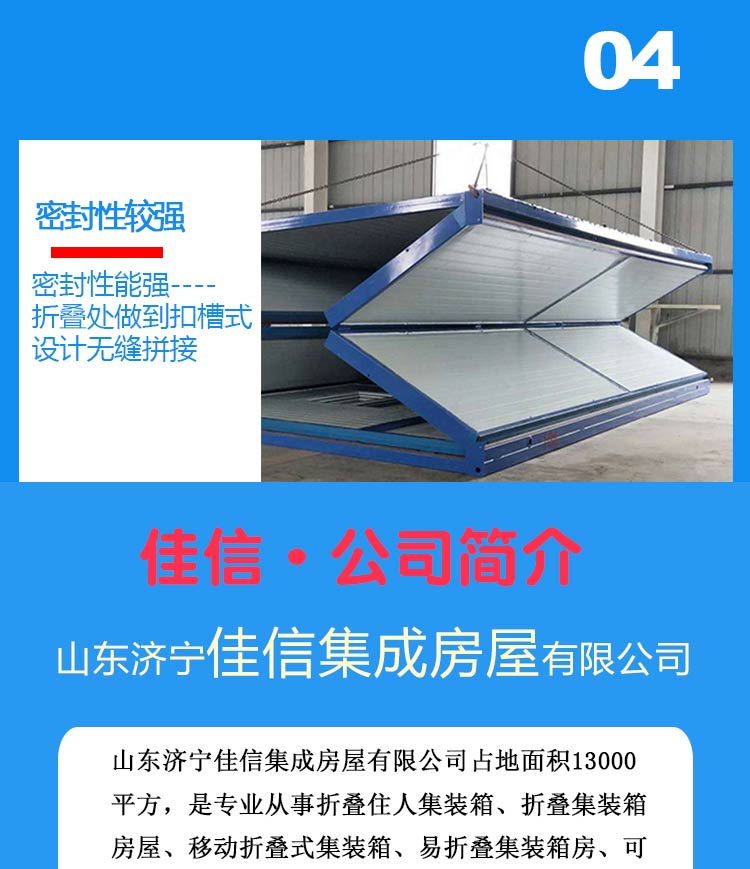 山东济宁佳信集成房屋有限公司占地面积13000平方,是专业从事折叠住人集装箱、折叠集装箱房屋、移动折叠式集装箱、易折叠集装箱房、可折叠集装箱、集装箱折叠、折叠集装箱、移动住人集装箱 、工地住人集装箱研发、生产、制造、销售、租赁等为一体的创新企业。产品销往世界等地,欢迎世界各地的客户来进行实地考察、洽谈合作。