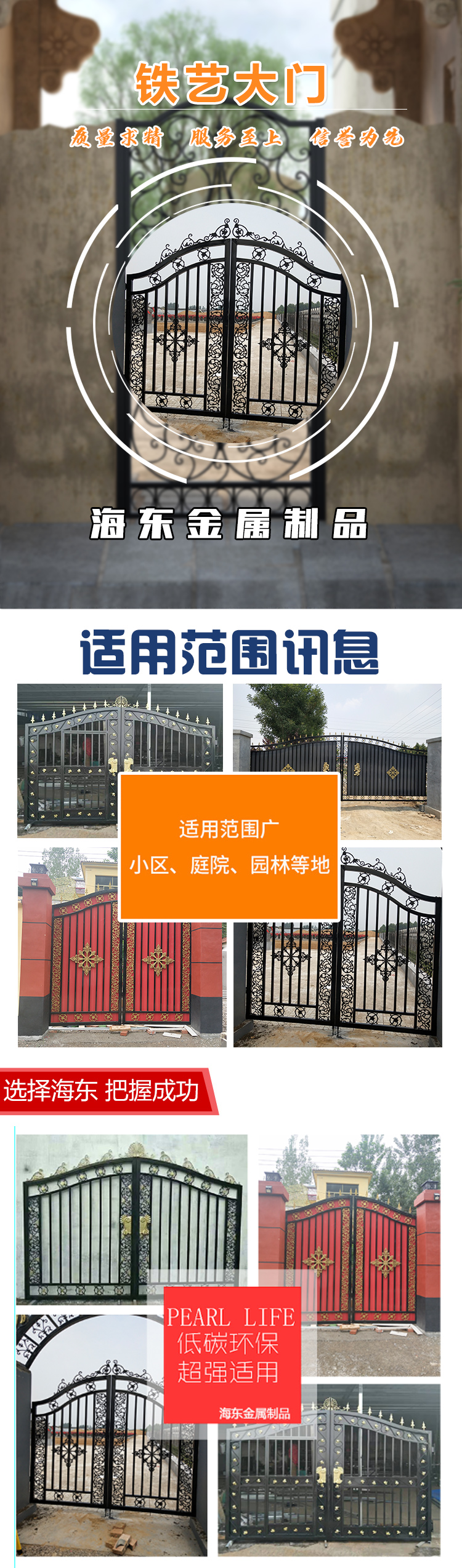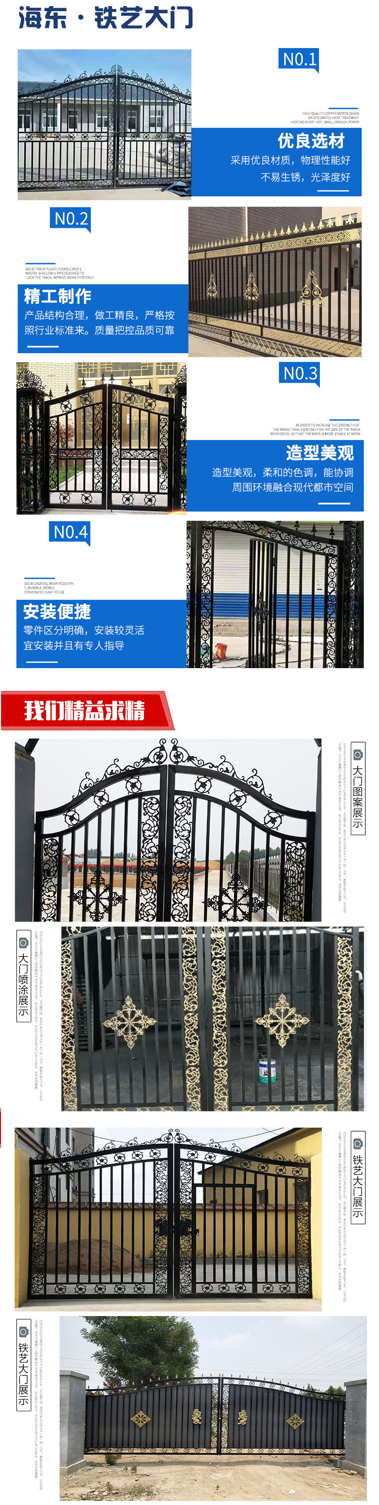 主要做法还是一方管做大门框架,然后使用铁板作底,把整个门做成实心的,然后在铁板上,框架里使用铁艺配件拼接镶嵌。这种实心门的性能就倾向于实用性,安全性,但是材料使用量比较多,在美观方面也不是很突出,比较适合做小尺寸的门,比如私家小院门。