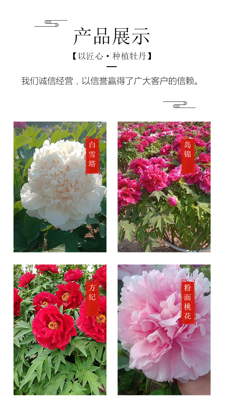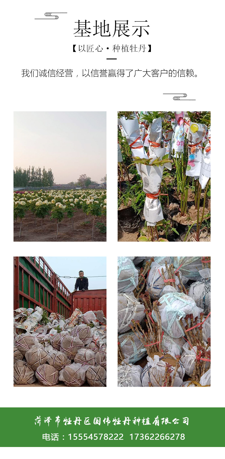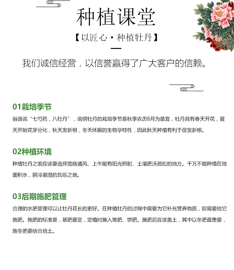 牡丹适宜在疏松肥沃、向阳干燥、排水良好的中性沙壤土中生长,一般在9月下旬至10月上旬栽植。牡丹的播种以3-4厘米为佳,播种后将其覆上土壤,并与地面持平,再轻轻将土壤规整平实,一次性浇透水。冬季要注意保温、保墒,要在其上覆盖谷草、树叶、马粪等物,或用地膜盖好。